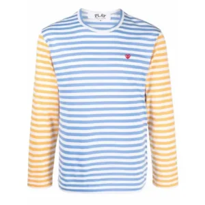 The CDG Play Embroidered Logo Striped Long-Sleeve Blue/Yellow Tee is the perfect fusion of bold fashion and effortless comfort. Designed