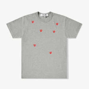 Elevate your casual wardrobe with the CDG Play Multi Red Heart Logo T-Shirt Grey, a perfect blend of comfort, style,