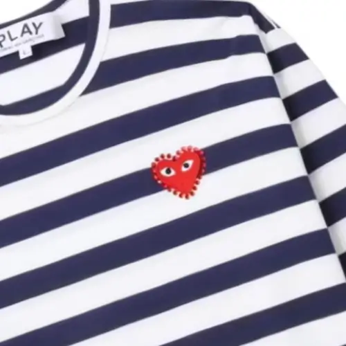 Make a bold yet sophisticated statement with the CDG PLAY Rhinestone Heart Striped L/S Tee (White/Navy). This long-sleeve T-shirt is designed for fashion lovers who appreciate effortless luxury and contemporary streetwear. Crafted with precision, it blends timeless stripes with a modern touch of sparkle, making it a standout piece in any wardrobe.